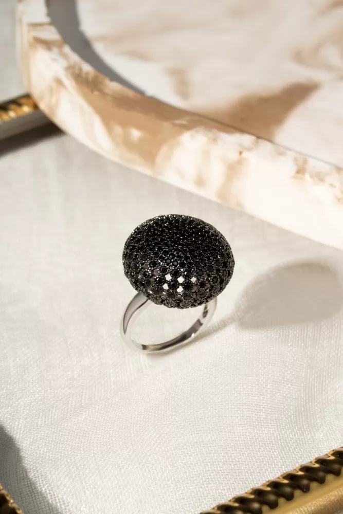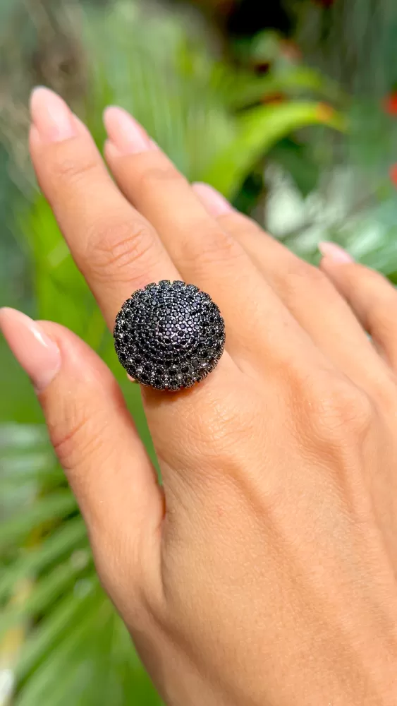 Anel Ródio Branco bola negra cravejada zircônias negras
