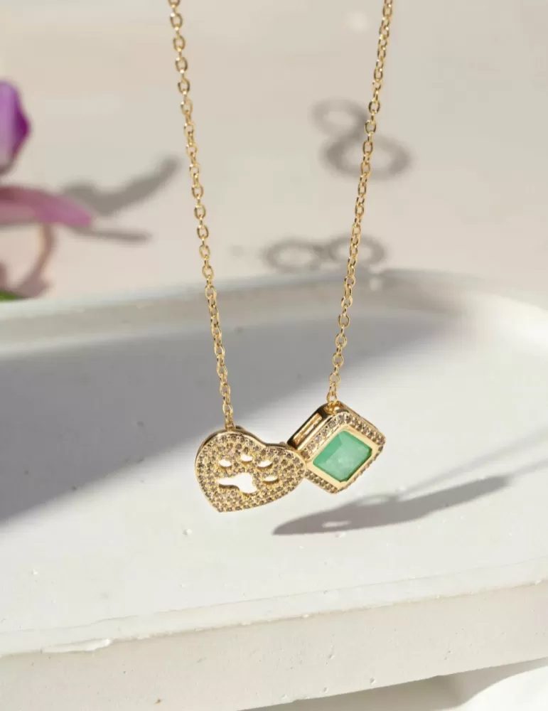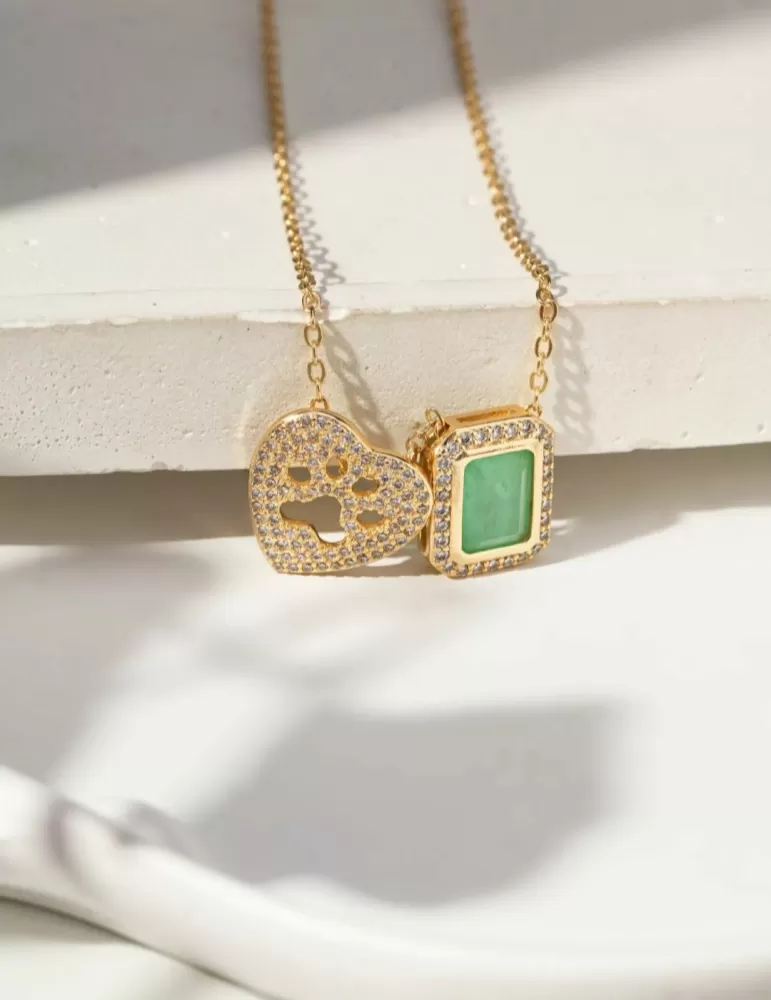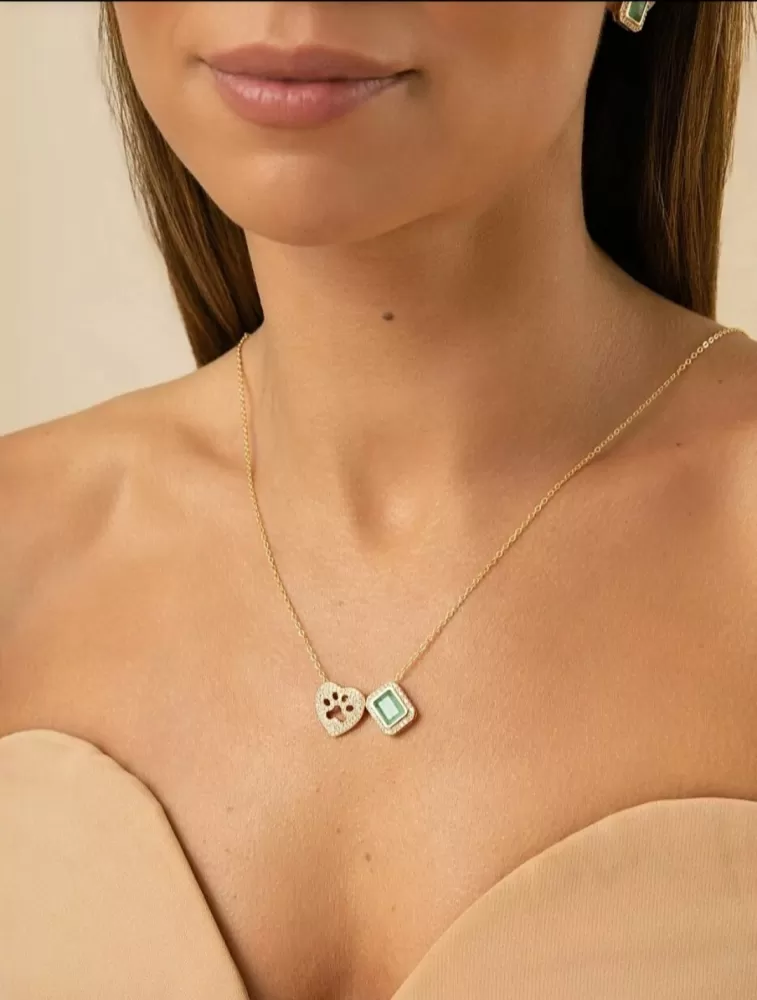 Colar Escapulário Pets, pedra fusion esmeralda e coração patinha pets zircônias cravejadas brancas